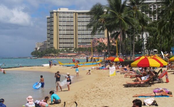 Pantai Waikiki di Hawaii menawarkan pesona pasir putih, ombak tenang, dan pemandangan indah yang sempurna untuk bersantai dan menikmati keindahan alam tropis.