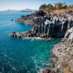 Pantai Jungmun Saekdal di Jeju menawarkan pantai berpasir putih, air jernih, dan pemandangan alam memukau, ideal untuk bersantai dan menikmati keindahan alam Korea Selatan.