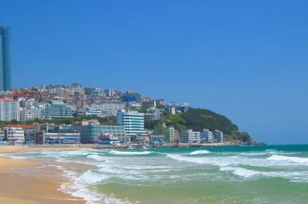 Pantai Haeundae di Busan, Korea Selatan, terkenal dengan pasir putih bersih dan pemandangan laut yang menakjubkan, cocok untuk bersantai dan menikmati keindahan alam.