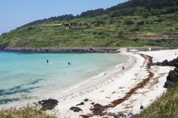 Pantai Hyeopjae di Jeju menawarkan pasir putih bersih dan air jernih, cocok untuk bersantai dan menikmati keindahan alam pulau dengan pemandangan menakjubkan.