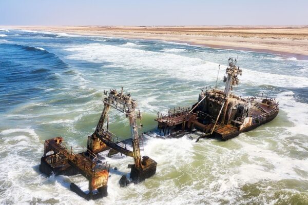 Pantai Skeleton Coast di Namibia menawarkan pemandangan dramatis dengan pasir putih, kapal karam bersejarah, dan keindahan alam yang menakjubkan di pesisir Atlantik.