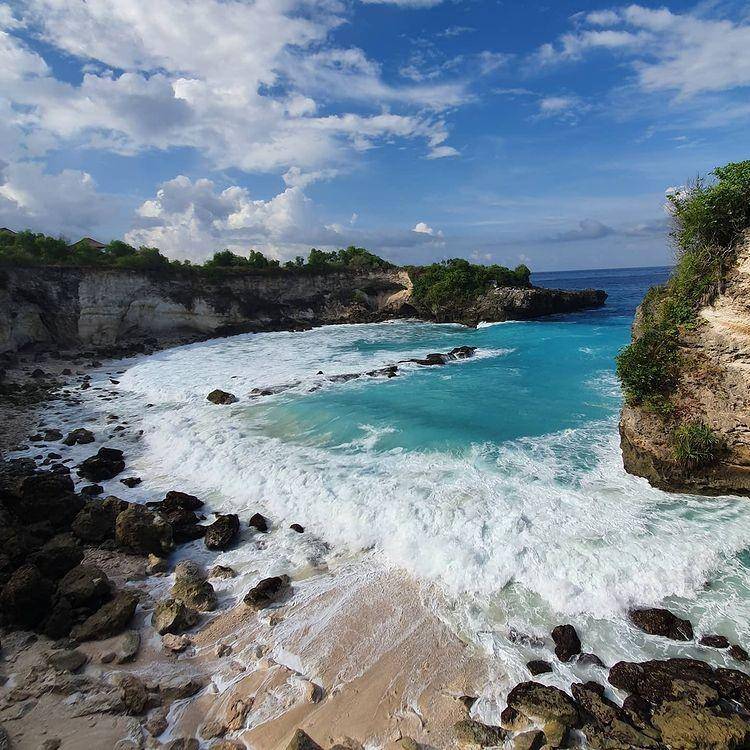 Di sepanjang garis pantai, pemandangan yang menakjubkan tersaji dengan latar belakang langit biru cerah dan ombak yang lembut. Air lautnya yang jernih memungkinkan pengunjung melihat ke dasar laut, menambah sensasi keindahan alami yang luar biasa. Panorama ini sering digunakan sebagai latar belakang foto-foto indah, baik untuk selfie maupun foto keluarga. Saat matahari bersinar terik, warna air laut tampak semakin mempesona, menambah keindahan alami pantai ini.